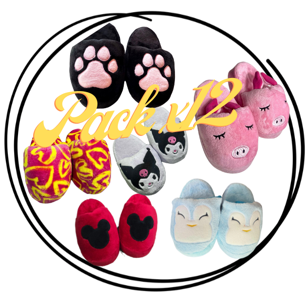 Pack x12 pantuflones animados bordados premium, sin eleccion, todos los pares distintos de diseños y talles surtidos.